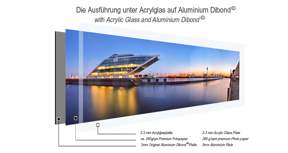 Der 6 Farben Tintenstrahldruck erfolgt auf einem Premium Fotopapier mit einer Stärke von ca. 260g/qm. Anschließend wird das bedruckte Papier auf dem Aluminium Dibond© Träger aufgezogen. Abschießend wird die ca. 3–4 mm starke Acrylglasplatte auf den Druck und den Träger kaschiert. Im Gegensatz zu anderen Anbietern erfolgt kein Direktdruck auf das Acrylglas. Dies gewährleistet eine brillantere Detailschärfe in Galerie-Qualität. Zu beachten ist noch, dass Acrylglas wie normales Glas bei ungünstigen Raum/Lichtverhältnissen spiegeln kann.