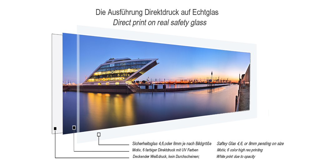 Der 6 Farben Tintenstrahldruck mit UV Farben erfolgt hochauflösend mit 2400 dpi auf Grünstich reduziertes ESG Sicherheitsglas, je nach Bildgröße in der Stärke von 4,6 oder 8 mm. Rückseitig wird zusätzlich ein Weiß Abdecklack aufgebracht der somit das Durchscheinen des Untergrundes verhindert. Unsere Wandbilder und Küchenrückwände auf echtem Glas zeichnen sich durch äußerste Detailgetreue, Brillanz, Farbintensität und Formstabilität aus.