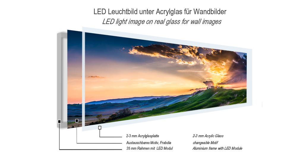 Unsere LED- Acrylglas Leuchtbilder sind ein hochwertiges und aufwendig gefertigtes Produkt. Die LED-hinterleuchteten Bilder werden von hinten mit einem LED Modul homogen ausgeleuchtet und können mit der im Lieferumfang enthaltenen Fernbedienung gedimmt werden. Das LED Modul befindet sich hinter einer 2-3 mm starken Acrylglasplatte, eingefasst in einen schwarzem eloxierten Aluminiumrahmen mit 34 mm Tiefe und 12 mm Breite. Das Flächenlicht ist mit modernster 24 Volt Technik ausgestattet. Zum Lieferumfang gehört das Netzteil passend zur Bildgröße, LED Controller mit Dimmer Funktion und Fernbedienung. Unsere Technik ist nicht vergleichbar mit nur am Rand beleuchteten LED-Bildern die keine oder unzureichende homogene Ausleuchtung erreichen. Die homogene Ausleuchtung erreichen wir durch jeweils auf das jeweilige Format und Bildmotiv aufwendig berechnete und abgestimmte LED Anbringung. Zu beachten ist noch, das Acrylgas wie normales Glas bei ungünstigen Raum/Lichtverhältnissen spiegeln kann.