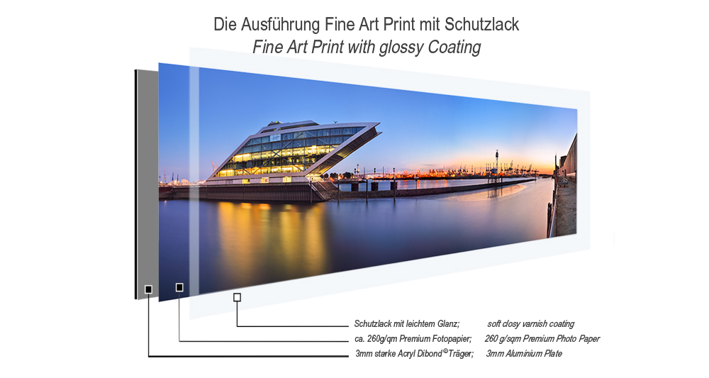 Unsere FineArt-Print Wandbilder sind eine preiswerte Alternative für eine hochwertige Wanddekoration. Durch Ihre glänzende Oberflächen-Beschichtung entsteht ein edler Eindruck, der Ihren Räumen das besondere Extra verleiht. Besonders große Ausführungen haben eine tolle Ausstrahlung. Durch die Glanz-Veredlung der Oberfläche entsteht nur eine äußerst geringe Spiegelung. Optional liefern wir die FineArt-Print Wandbilder auch mit einem matten Schutzlack.